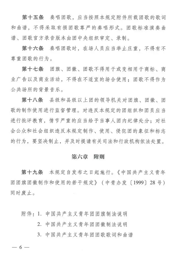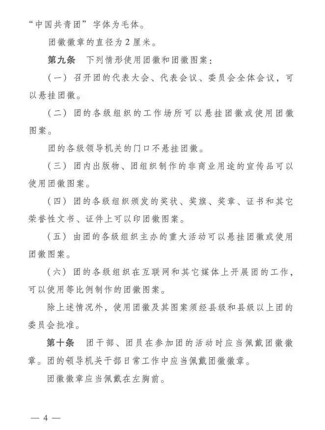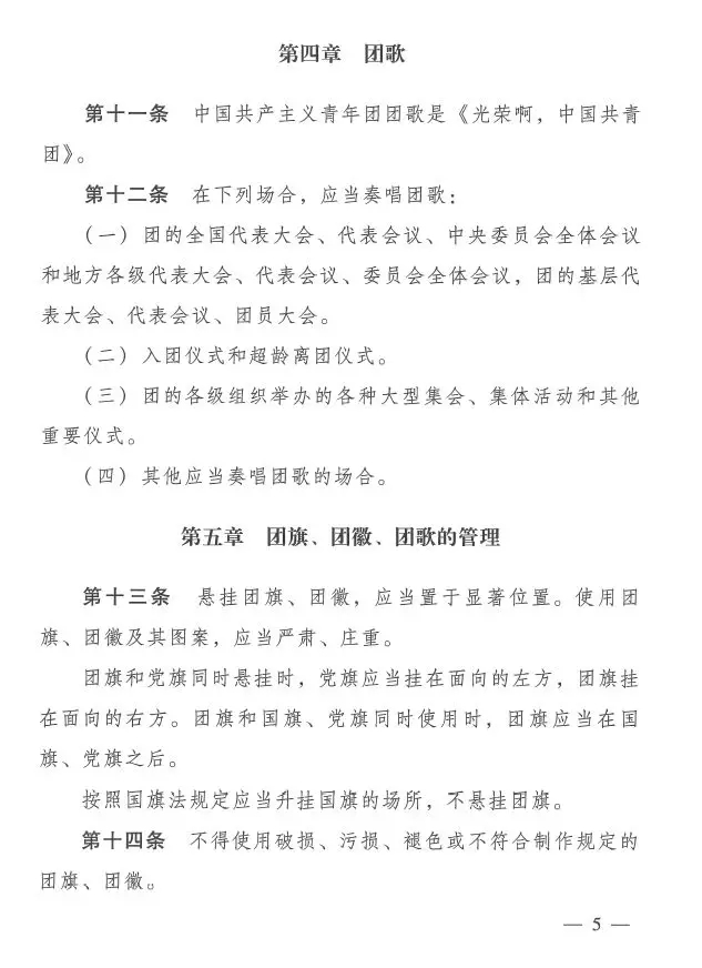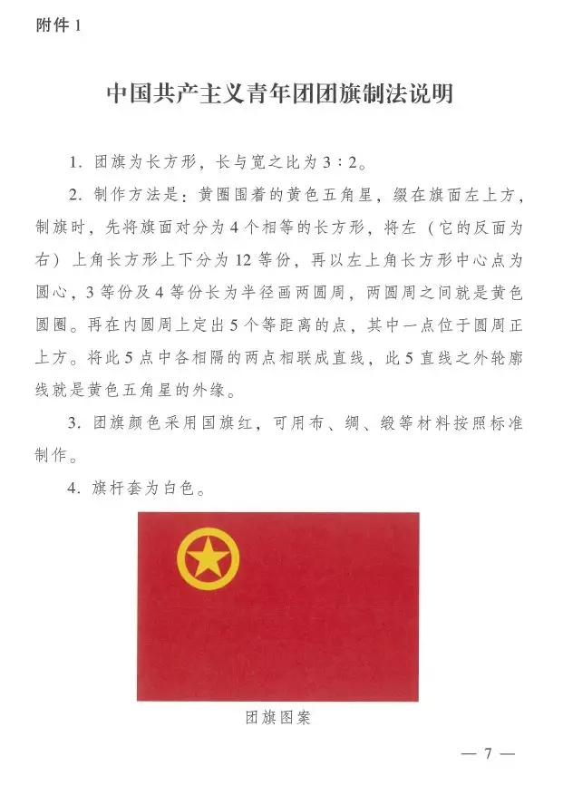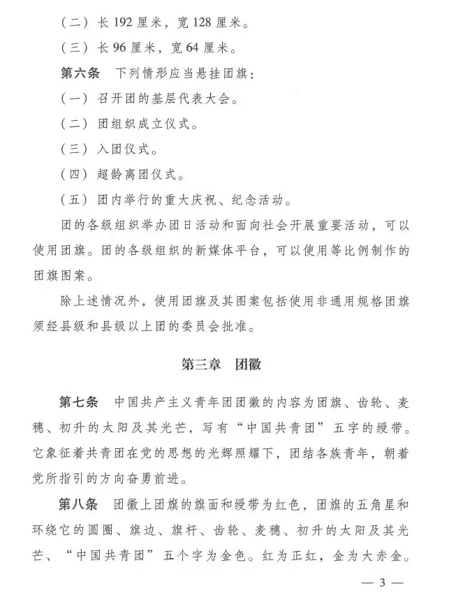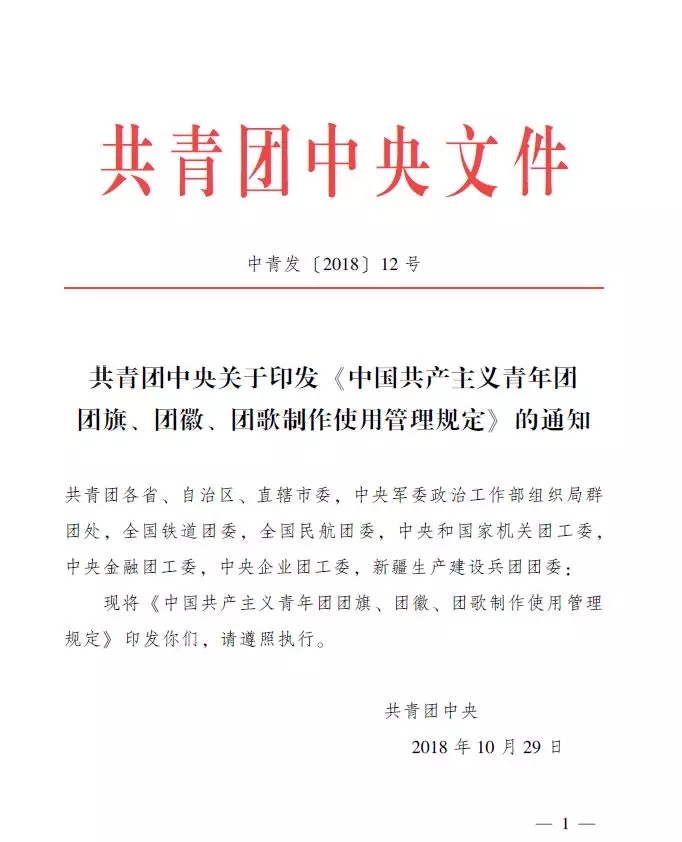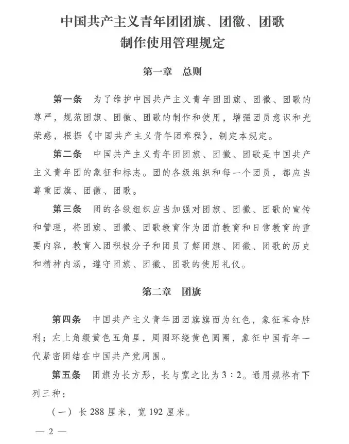近日,共青团中央印发了《中国共产主义青年团团旗、团徽、团歌制作使用管理规定》,对团的标识的制作和使用管理作了进一步规范。