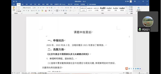 赵吉峰副教授结合自身的申报经历和心得,从最开始的选题缘起,到最终的论证完毕,与老师们进行了详尽地分享,具体到每一个环节、每一个步骤的细微处理方法。