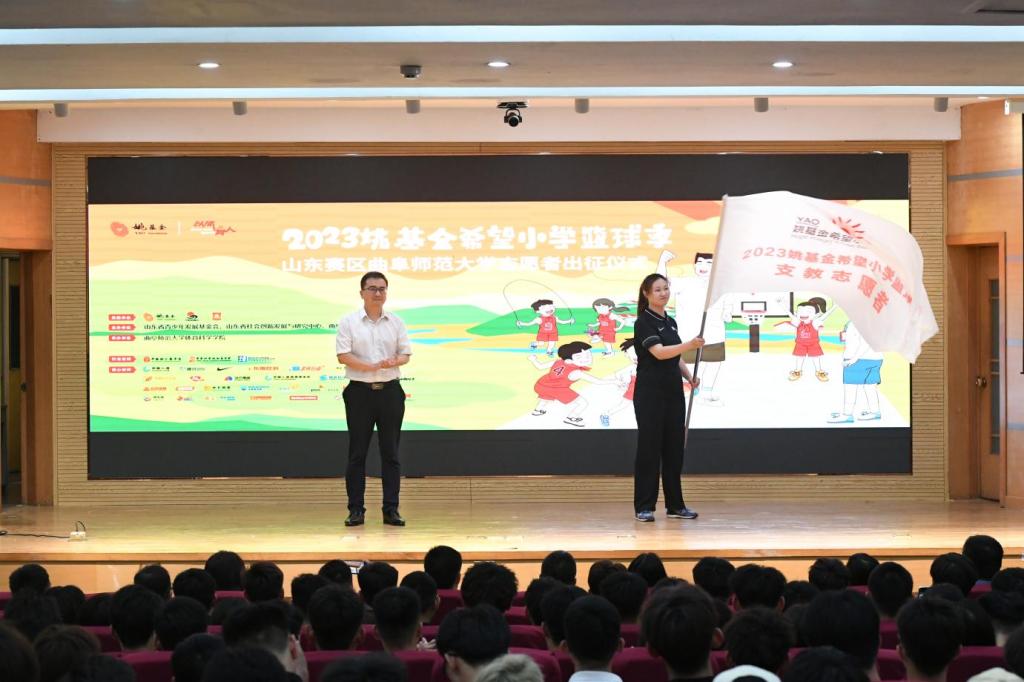 团委书记孔轶众为志愿者代表马蔓妮授姚基金希望小学篮球季支教志愿者旗。