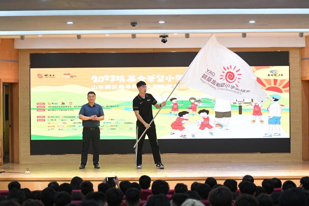 山东省青少年发展基金会资助部部长董晓峰为志愿者代表李柯阳授姚基金希望小学篮球季旗,疯av