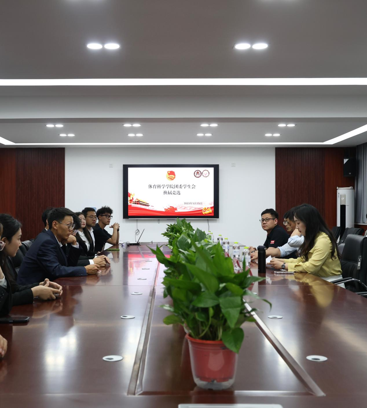 于教学楼会议室进行第六届团委、学生会主席团换届竞选演讲。体育学部党委副书记马振华、疯av