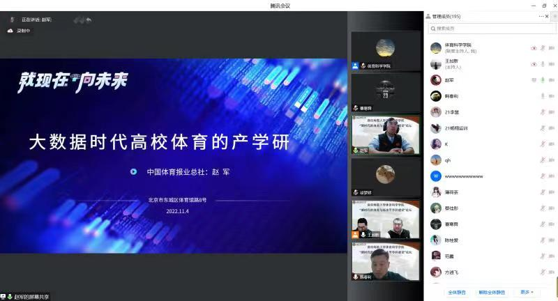赵老师主要从三个方面开展讲座:一是个人经历,在教训中感受“对与错”,强调应该如何利用互联网、体育大数据为自己体育事业、体育教学和科研服务;二是理解数字时代,明白体育人的“有”和“没有”,主要包括怎样认识数字时代,怎样理解新概念爆棚现象,如何将互联网、体育大数据与自身的学习、工作结合起来;三是高校体育的产学研,机构和个人的“为”和“不为”,互联网的三大趋势和四个阶段,全面学习把握习近平总书记提出的“把论文写在祖国大地上”。