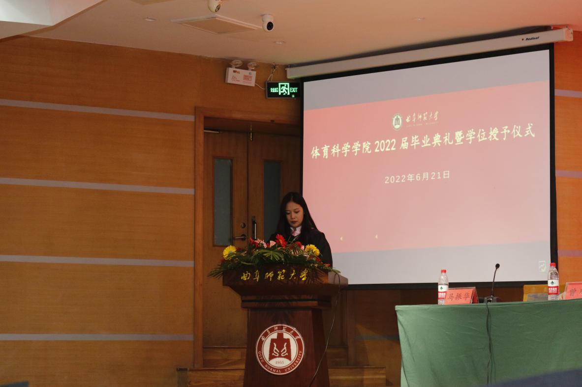院长姜付高致辞。代表学院全体师生对2022届毕业生表示衷心祝贺,他强调,在曲园,同学们因体育而改变,收获了强健“体格”、健康“性格”和完全“人格”,今后同学们也必将为体育而逐梦。在未来的路上,希望同学们能够用体育精神立立志、善学,用行动践行体育精神,用体育讲好中国故事。