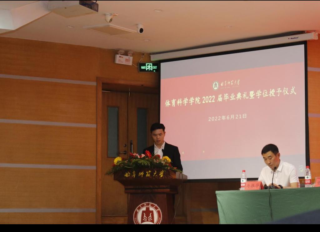 2022届优秀毕业生代表李若琛、高国程依次发言。他们感叹在曲园的时光转瞬即逝,感谢学院的培养,感谢老师的谆谆教诲,作为毕业生必将牢记母校重托,在青春的赛道上奔跑,争取跑出当代青年的最好成绩。