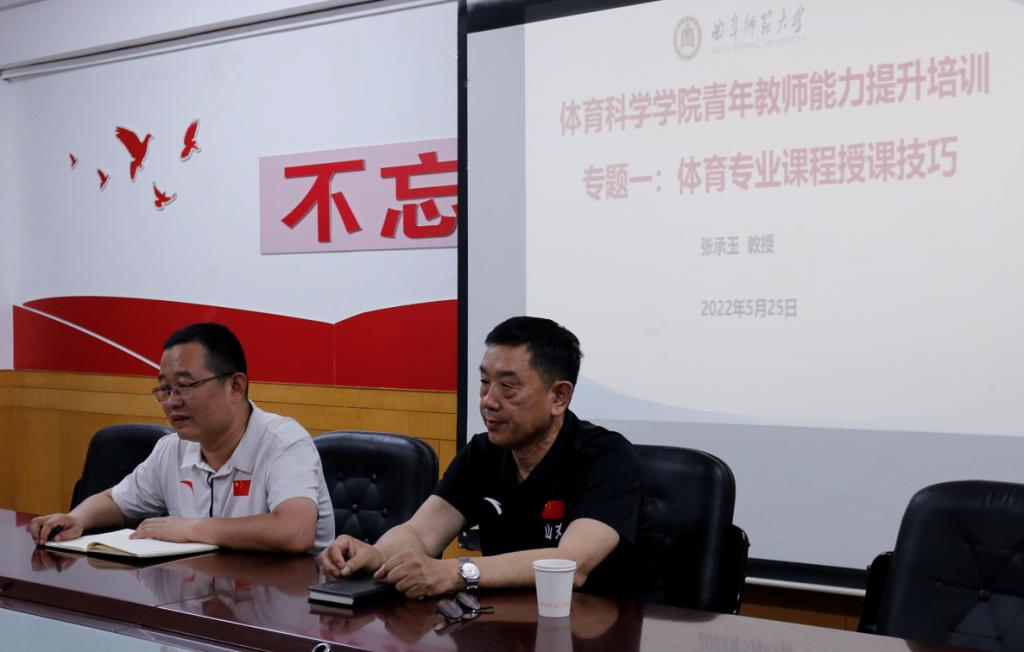 为提高学院青年教师的教学水平,2022年5月25日下午,学院在109会议室举办青年教师能力提升培训专题报告会,本场专题报告专门邀请了我院教学经验丰富、多次担任教学比赛评委的原体育学院副院长张承玉教授,张教授就“体育专业课程授课技巧”作了首场报告,培训会由副院长伊超主持,学院近十年入职的青年教师参加了此次培训。