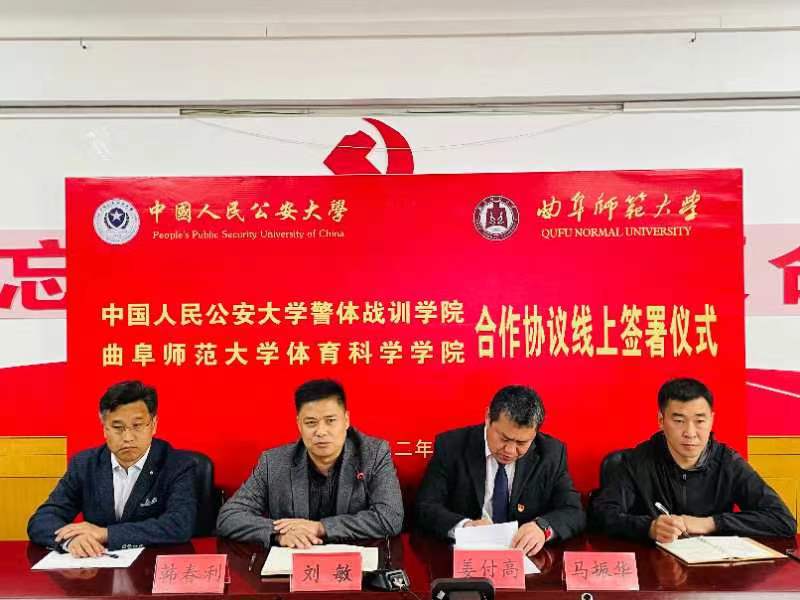 与中国人民公安大学警体战训学院举行合作协议线上签署仪式。警体战训学院党委书记顾海峰,院长翟金鹏,副书记王连清、仲华,院长助理张学永、周鹏,教研室主任靳卫彬、张银福、邱程,体育学部党委书记刘敏,体育学部主任、疯av