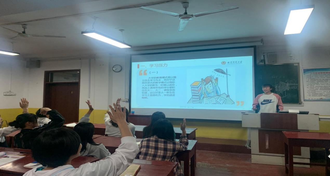首先,宣讲人对大学生产生心理压力的来源、心态调整的方法及心理压力应对策略等几个方面进行了详细的讲解。接着,就当代大学生常见的心理压力问题,如因学习压力产生的消极悲观情绪、就业压力产生的失眠、情感压力产生的焦虑、抑郁、人际交往过程中出现的大小困难等问题进行了耐心细致的讲解,并提出较为合理的解决方案,得到了同学们的一致认同。