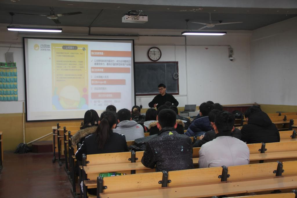 一开始高昌久老师对动因体育公司的发展历程做了简单介绍。紧接着对动因体育的优势、企业福利、所获奖项、职业发展路线等进行了具体介绍。动因体育公司成员大多数是九零后,成员们年轻有活力,对工作态度端正,短短的几年时间就把动因体育打造成市值100亿的行业内最大企业。刚结束研究生考试的应届毕业生丝毫不受考试压力的影响,积极主动的和高昌久老师进行互动问答,对公司的薪资待遇、就业城市选择、自身体育专业与应聘单位等问题进行询问。