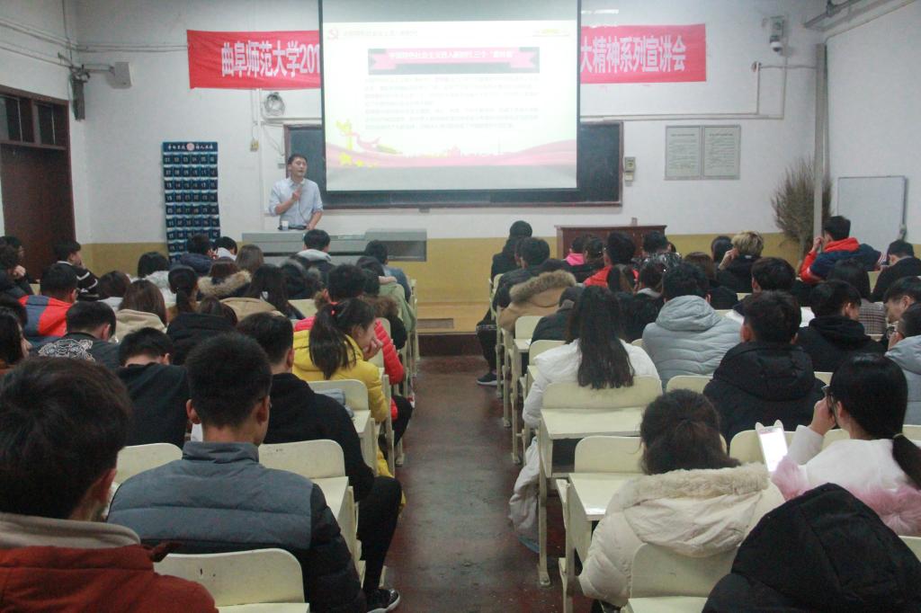 本次培训以“聚焦党的十九大-习近平总书记十九大报告精读-深入学习贯彻党的十九大精神”为主题进行宣讲。活动开始,由学生会主席王烁介绍本次培训的目的,介绍本次的主讲老师并宣布本次培训开始。接下来,朱老师进行自我介绍,并说明本次宣讲从十九大的会议内容、习近平总书记报告解读、十九大政治报告中的儒家思想三个方面进行宣讲。朱老师首先从十九大的会议主题、议程安排、会议重要意义三方面介绍了十九大,之后从中国共产党十个方面的历史成就、中国特色社会主义进入新时代的三个“意味着”、一个历史使命与四个伟大、八个明确等内容进行讲解。接下来,朱老师重点就优先发展教育事业、提高就业质量和人民收入水平等七个方面的民生问题进行解读。最后,朱老师通过具体的分析详细说明了十九大政治报告中的儒家思想。最后,本次培训会在热烈的掌声中落下帷幕。
