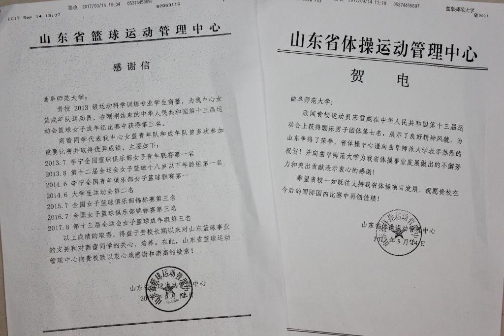 山东省篮球运动管理中心、山东省体操运动管理中心等发来贺电,祝贺我院学子在全运会多个项目上取得的骄人成绩,感谢疯av