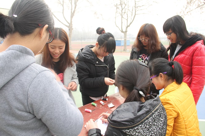 本次活动共分为五个项目,五个项目同时进行,每个项目有两个负责人兼裁判。项目一:有胆你就来,单人参赛,参加者在桌子前面向左,向右各转三圈,然后用长筷子夹溜溜球,计时三分钟,在规定时间内由溜溜球数量决定名次。项目二:你来比划我来猜,比赛以小组为单位,自由组合两人一组,由裁判随机出题,一人用身体动作比划,一人猜,比划时不许发出任何声音,否则题目作废,比赛时间为三分钟,规定时间内猜中题目,由题目的数量决定名次。项目三:让乒乓球飞,单人参赛,在距离纸箱两米处往纸箱内投掷五个乒乓球,由完成的时间决定名次,但时间不得超过十分钟,十分钟内未完成比赛,则计个数。项目四:相亲相爱背背跑,比赛以小组为单位,自由组合两人一组。在十米的场地上,二人背靠背,臂肘互相挂着,哨声响起后,一人背着另外一人前进,在标志杆处交换位置,返回原点,记录时间,由时间决定名次。项目五:穿针引线单人项目,将十根绣花针穿在一根线上,记录时间,由时间决定名次。同学们踊跃报名参赛,现场气氛热烈,同学们热情高涨,将比赛记录一次次刷新。在活动的最后,根据选手们的表现设立了奖项,每个项目分为一二三等奖并有相应礼品,一等奖各两名,共十名,二等奖各四名,共二十名,三等奖各六名,共三十名。