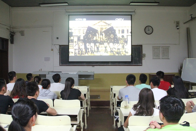 全体学生党员、预备党员、入党积极分子,学生会主席团成员和各班班长、团支书于学院209教室观看历史文献纪录片《筑梦中国》。