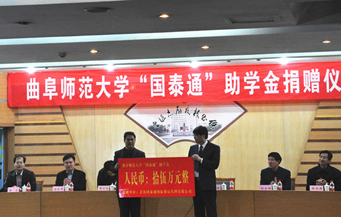 “国泰通”助学金捐赠仪式在我校孔子会堂隆重举行。出席捐赠仪式的有校友孙国成,学校副校长扈庆学,学校办公室主任夏云杰,学校学生工作处处长杨永明,学校团委书记屈跃宽,学校招生就业处副处长杨东,我院党总支书记荆兆清,副书记展利民,团总支书记赵峰,辅导员李娜。本次会议由学校办公室主任夏云杰主持,副校长扈庆学、青岛国泰通国际货运代理有限公司董事长、疯av