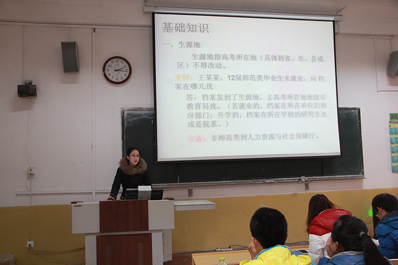 活动开始,王欢从就业手续办理平台,如何办理签约与解约手续,如何办理二次派遣,如何办理调整调派,就业转升学、升学转就业相关手续办理,毕业生档案转递七方面问题进行讲解。其后,同学们就自己关心的问题向王欢和其他同学咨询,现场有问有答,场面温馨自然。最后,唐海峰对本次知识培训进行总结。