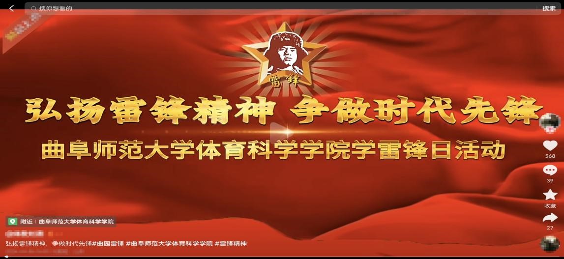 学子从活动刚刚开始积极参与制作收集相关材料,并制作成视频。视频中,体院学子们向大家讲述了雷锋精神的时代内涵,强调雷锋精神对新时代建设和社会精神风貌构建所起到的重要作用,同时展现了雷锋精神世代相传的生命活力,更是号召新时代青年与时俱进学雷锋,传承并弘扬雷锋精神。
