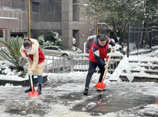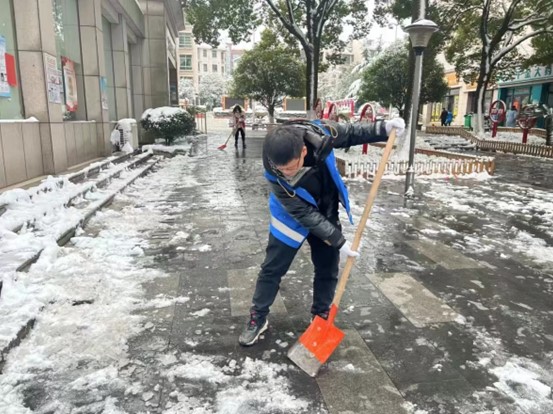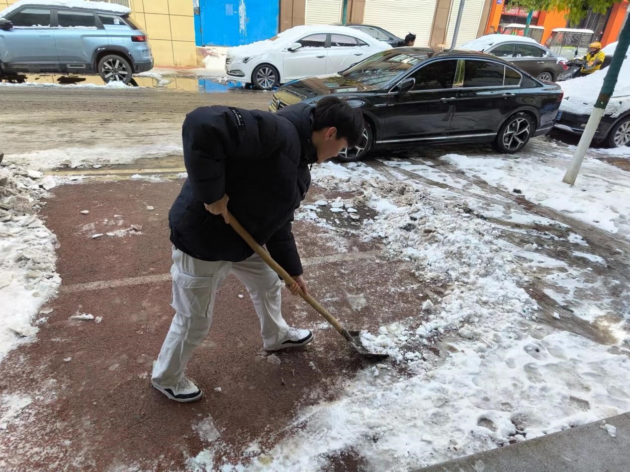 实践队员们拿起铁锹、扫帚等工具,集中对社区的主要干道及陡坡等易结冰危险区域的积雪进行清理。虽然天气寒冷,但志愿者们撸起袖子干劲十足,一把铁锹、一杆扫帚都成了他们手中的清雪“神器”,热火朝天的劳动场面让严寒的天气也显得暖意浓浓,忙碌的身影构成了一道亮丽的风景线。大家一边扫着雪,一边提醒着过路的行人注意安全,提醒沿街的商家自扫门前雪,整个社区充满了温暖和谐的气氛。