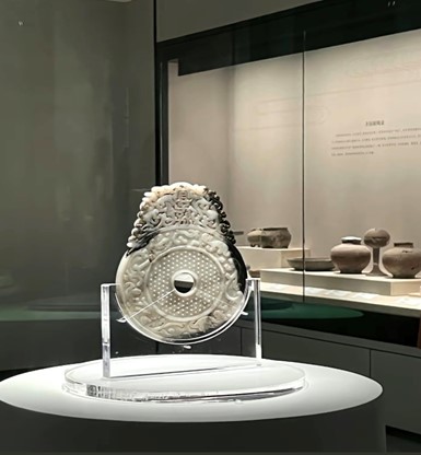 馆中另一件镇馆之宝为东汉宜子孙玉壁,国内罕见的刻有汉字的汉代大型馆藏玉璧。典型的出廓壁,由上等和田玉雕刻而成。下为圆形,内区饰蒲纹及乳丁,外区是螭虎纹。廓的部分为两条透雕龙出没祥云之中,二龙之间用篆书刻“宜子孙”三字,是长宜长孙的简称。体现了封建家长的一种期许。玉璧呈现出一种和谐的美德,充满动态和灵气,堪称汉代玉器的上乘之作。