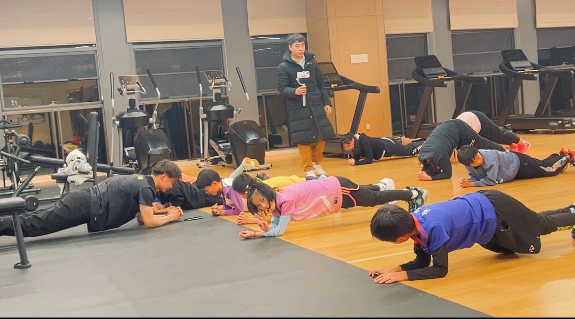 (图中为实践队员宋沛璟与学员一同进行核心力量训练 于洁 摄)