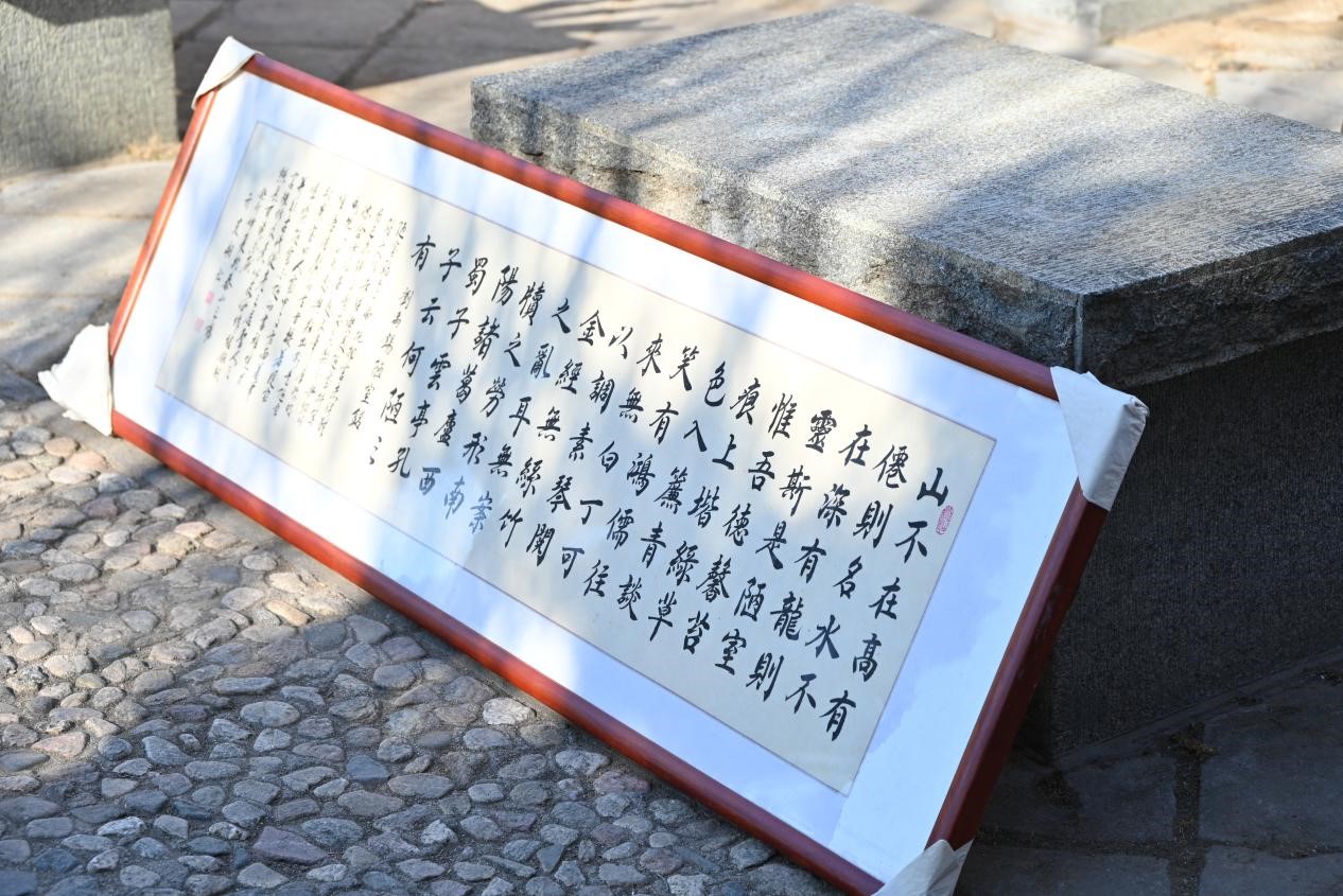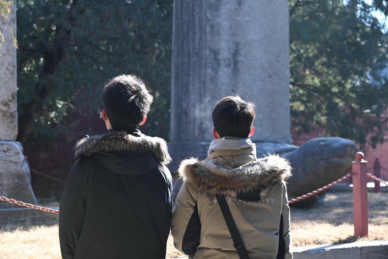 在工作人员的引领下,实践队员们分别参观了岱庙里古木参天、石碑林立、殿宇巍峨、环境清幽的景象。游走于其间,仿佛有一种时空穿越之感。实践队员们在碑石前瞻仰,寻找历史的痕迹;在“汉柏”“唐槐”下,聆听它们穿越千年的故事;在古建筑前,凝视其飞檐和斗拱,赞叹古人的智慧。这一眼千年的文化冲击力,是在学校里难以感受到的。