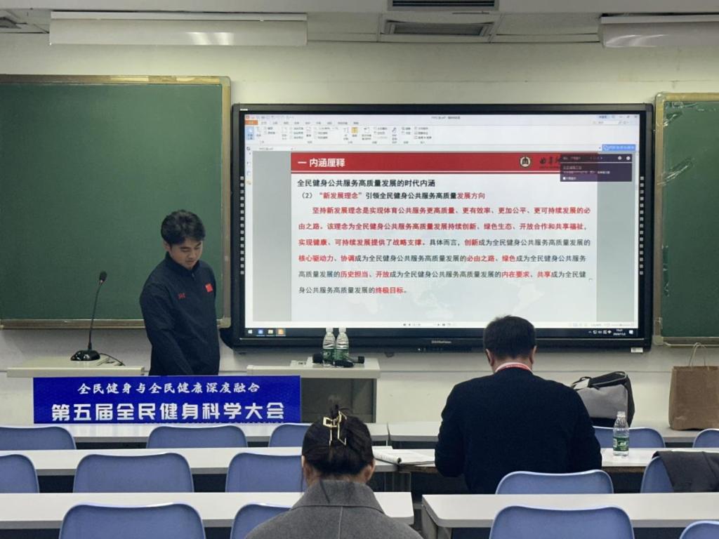 的基本情况和近年来取得的成果,并进行了《新挑战·新动能·新生态:我国“马拉松”赛事发展的思考与建议》的主旨报告。随后,分会场20位学者围绕全民健身领域分别上台进行专题汇报,汇报内容丰富多样,从运动科学到健康促进,从政策解读到实践案例,为参会者带来了全面且深入的行业洞见,学术氛围浓厚,思想碰撞不断。最后,赵鲁南教授详细点评了与会者的研究内容,并作了总结性发言。