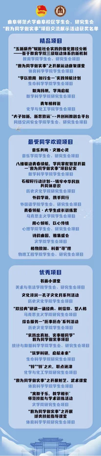 学生会的“开展运动康复课堂”项目荣获精品项目,学生会的“开展射艺、武术课堂”项目、研究生会的“球类技能指导课堂”荣获优秀项目。