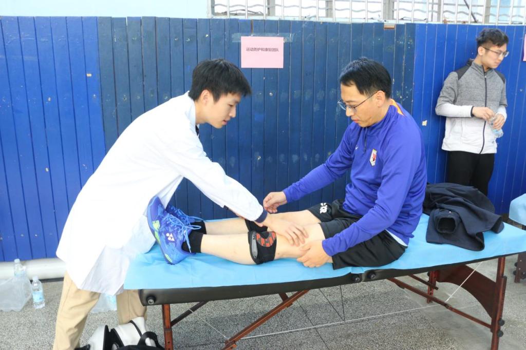 (图为志愿者为羽毛球参赛老师和同学进行针对性放松)