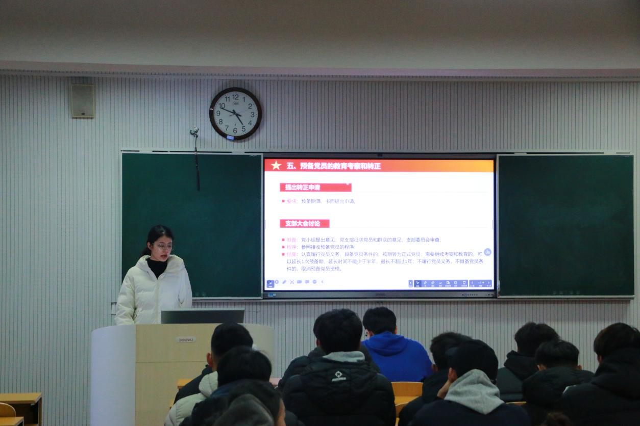 2022级辅导员王冰担任主讲人,以“党旗飘扬的方向——党建工作实务”为主题,讲授团课,聚焦党员发展流程中的“确定发展对象和考察”等核心实务要点。疯av