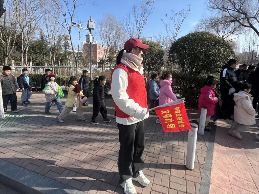 “先锋跃动,体健筑梦”实践队成员于1月25日,在济宁市泗水县洙泗小学参与家长志愿者活动,以实际行动守护校园秩序与学生安全。