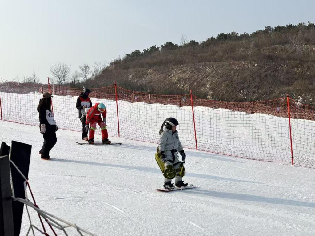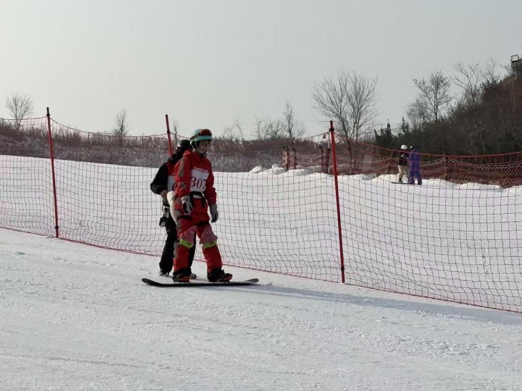 在滑雪场中,实践队员们的身影格外醒目。他们身姿矫健,滑行流畅,展现了体育专业学生的扎实功底。然而,他们的角色远不止于普通滑雪者。凭借专业所学,许多队员迅速转型为“临时教练”和安全协理员。在实践现场,可以看到实践队队员,正耐心地为一位初次尝试单板滑雪的儿童调整脚的训练辅助装置。队员间互相检查装备、指导动作的场景随处可见,专业知识在互助中传递,团队精神在冰雪间凝聚。