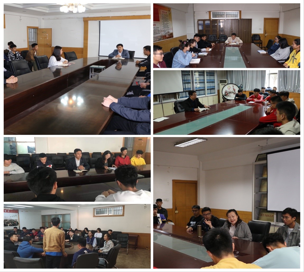 分别在一楼会议室及多个教室举行处级领导干部联系学生班级工作座谈会。资产管理处周鹏、廖志强、魏兴利、曹成武,继续教育学院茌淑君、马秀峰、邢春雷、晏逾,体育教学部李兆进,疯av