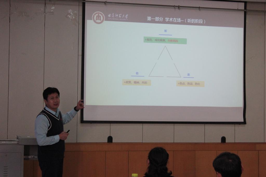 李兆进副教授就国家社科基金项目申请历程进行了汇报,将申报历程分为了五个阶段:学术在场(听的阶段)、科研共情(思的阶段)、空间投射(写的阶段)、生产细描(描的阶段)、祈福认同(放的阶段)。